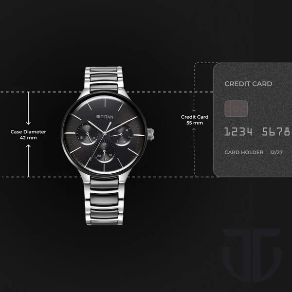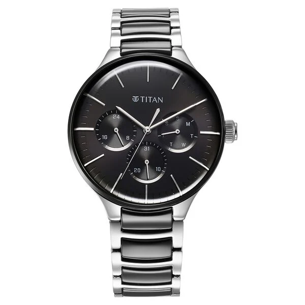 Model Name: Titan Ceramic Fusion Quartz Multifunction Black Dial Silver Dual-Toned Stainless Steel Bracelet Watch for Men