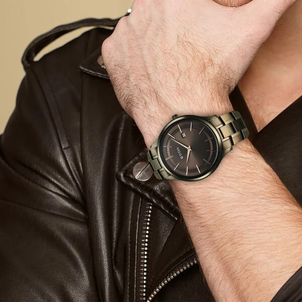 The watch showcases a rich brown dial that adds warmth and character to the overall design. The dial is thoughtfully arranged with clear hour markers and a date display window, allowing you to keep track of important days while maintaining a clean and balanced appearance. Its elegant analog layout ensures excellent readability while enhancing its timeless appeal.