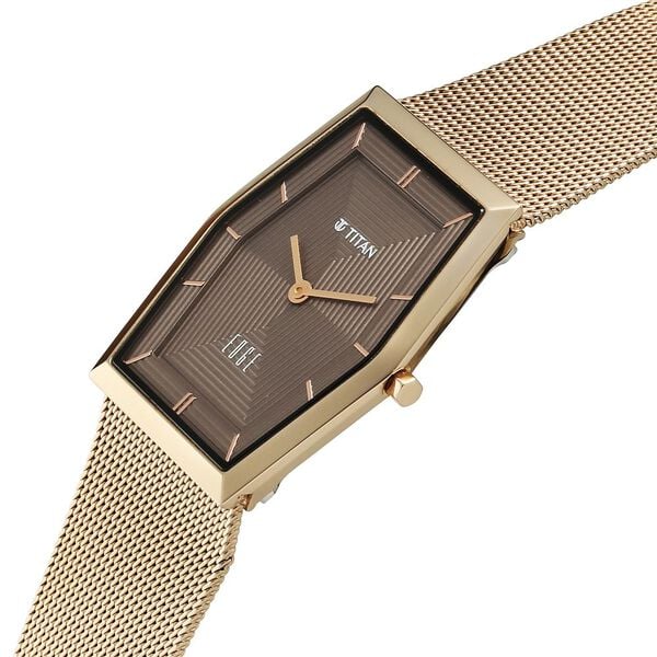 Elevate your style with the Titan Edge Whimsey Quartz Analog Watch for Women. Featuring a warm brown dial and a golden stainless steel strap, this ultra-slim watch blends modern elegance with timeless sophistication.