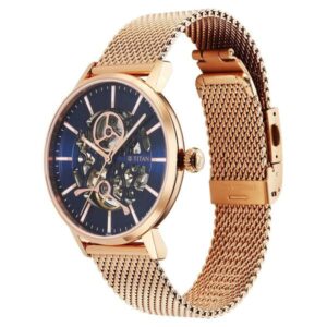 Elevate your style with the Titan Mechanical Slimline Watch for Men. Featuring a striking blue dial and a rose gold mesh strap, this watch blends classic mechanical craftsmanship with modern elegance.
