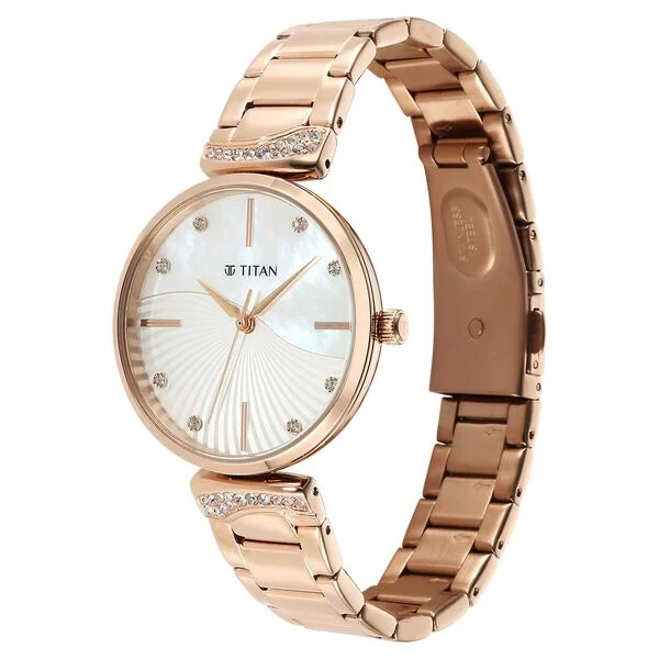 Add a touch of elegance to your wrist with the Titan Purple Style Up Quartz Analog Watch for Women. Designed for the modern woman who appreciates timeless beauty, this watch showcases a mesmerizing Mother of Pearl dial that reflects light beautifully, giving it a unique and luxurious appeal.