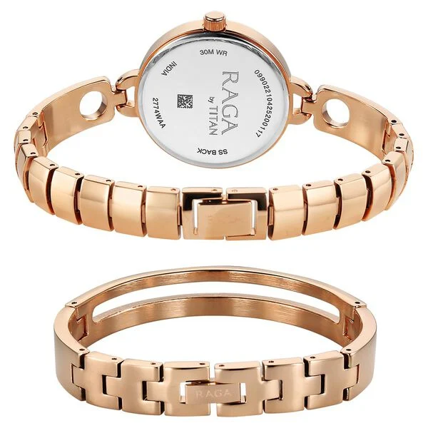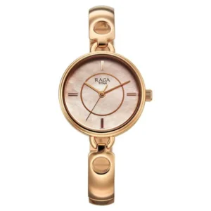 Titan Raga Contempore features a rose gold case, mother-of-pearl dial, and elegant metal strap—perfect for feminine sophistication and timeless style.