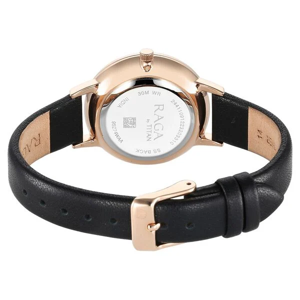 Model Name: Titan Raga Showstopper Quartz Analog Mother of Pearl Round Dial Black Leather Strap Watch for Women